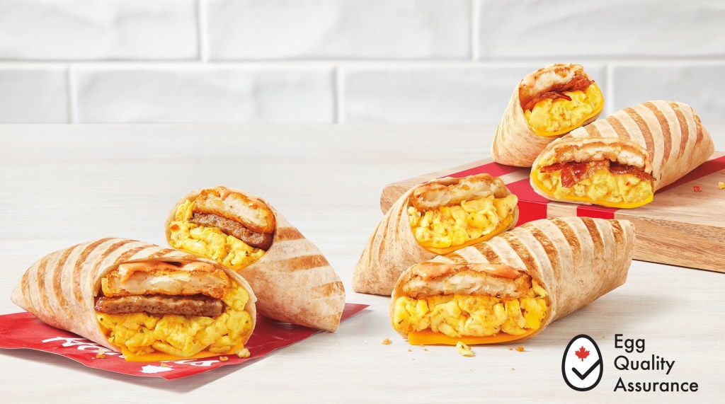 All the Scrambled Egg Loaded Wraps include a hash brown and the sauce that goes into the “iconic” Tims Farmers Wrap.